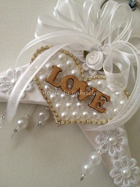 | O coração foi pintado com tinta pva branca e cravejado com strass e chatons de pérolas. Pra finalizar recorte LOVE colado por cima. |